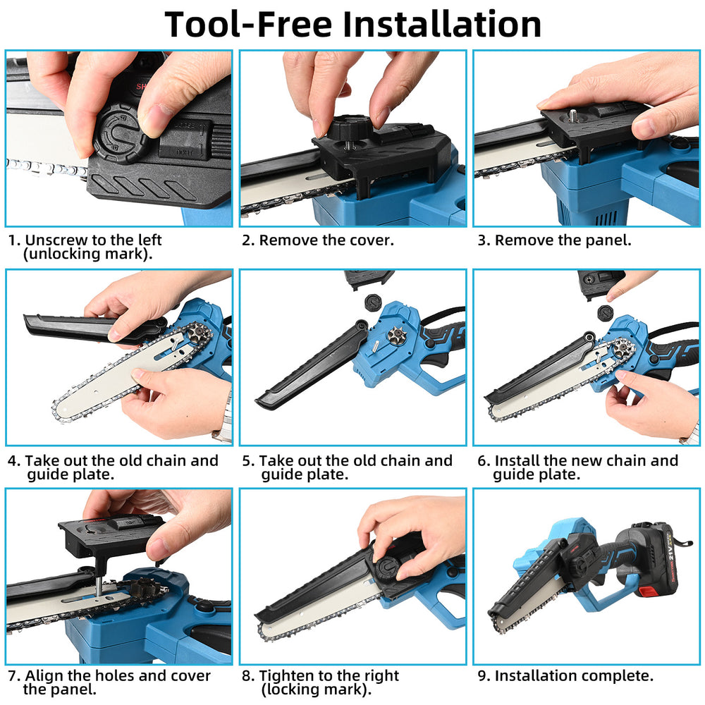 【Tool-Free Installation】The electric pole saw installation and mini chainsaw chain installation require no tools and can be used directly. You can work safely and confidently, our unique tool-free chain tensioning system can tension the chain in just a few seconds.