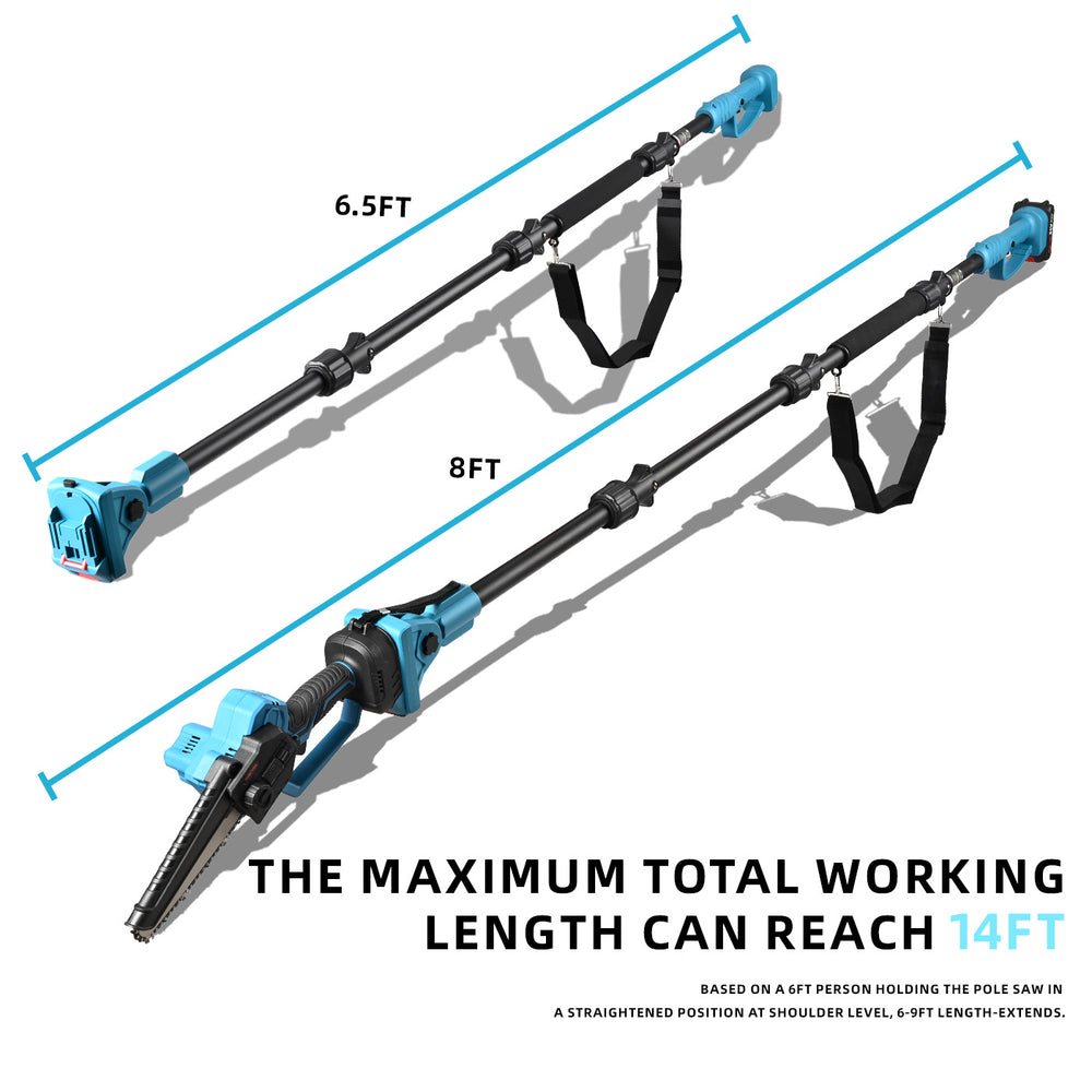 【2-In-1 Flexibility】The handheld or pole saw in seconds: Cut low or reach high( extendable up to 14 feet), rotatable head making it easy for high wood cutting.